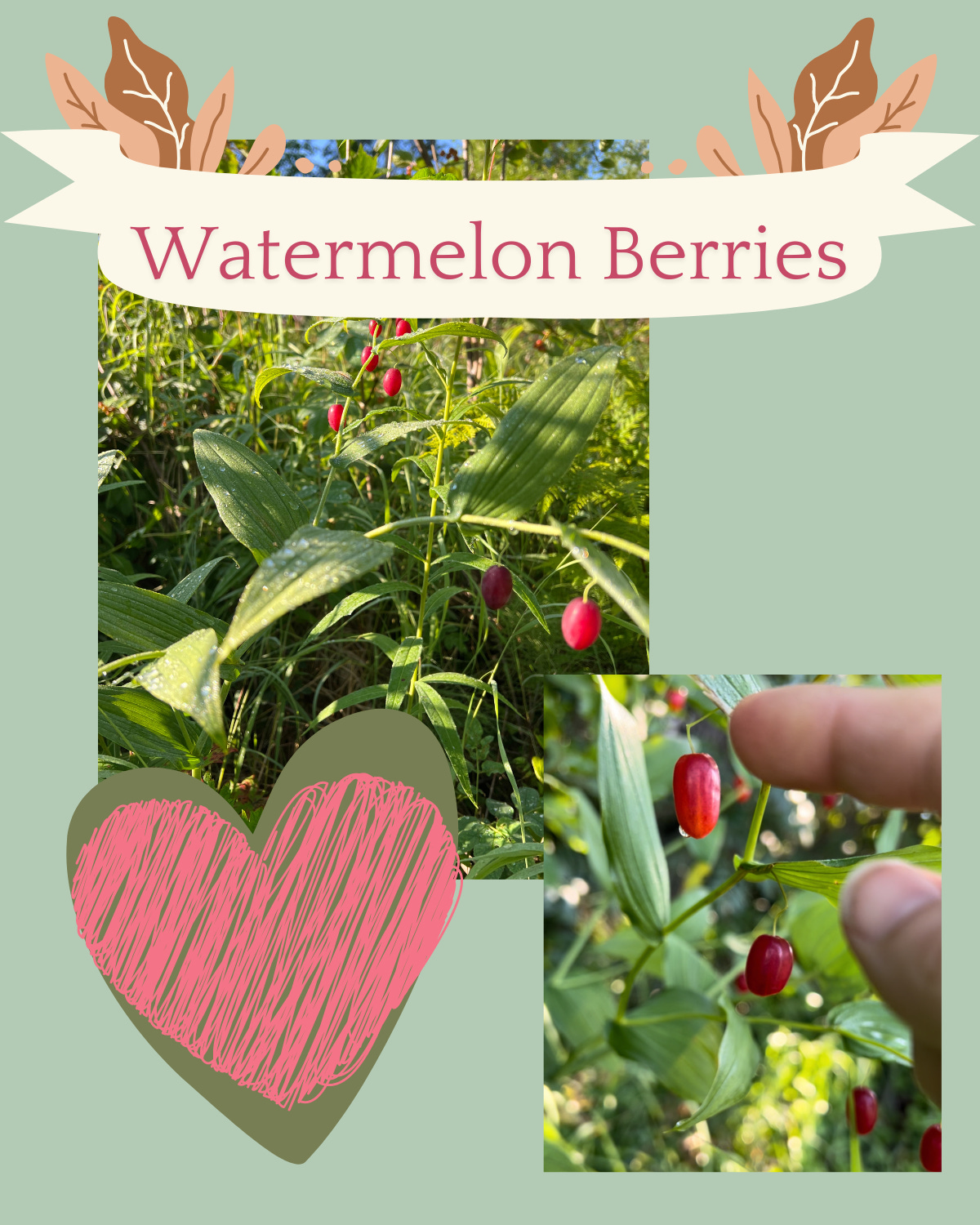 Description: This is a new favorite of mine, not that this should be in the description, but I was just so giddy when I discovered this flirty little plant, and I want to share my excitement. Watermelon berry is from the lily family, which you can see from its leaves which “clasp” the stem like a little hug instead of hanging from its own stem. Each berry hangs from a little kinked or “twisted” stem as shown in the bottom picture. The berries are oblong like mini watermelons and have a similar taste (warning, they are very seedy). The thin stalk, when harvested, has the taste of cucumber.