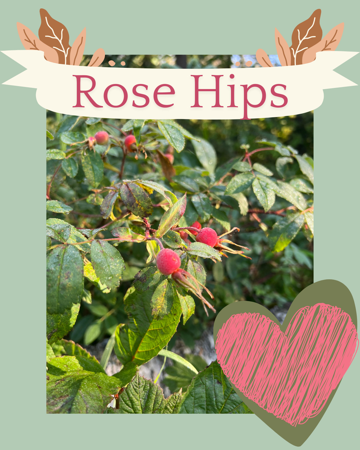 Description: rose hips are the fruit of wild roses left behind after the petals fall away. They show up in summer and develop into plump orange/red “hips” during the fall.